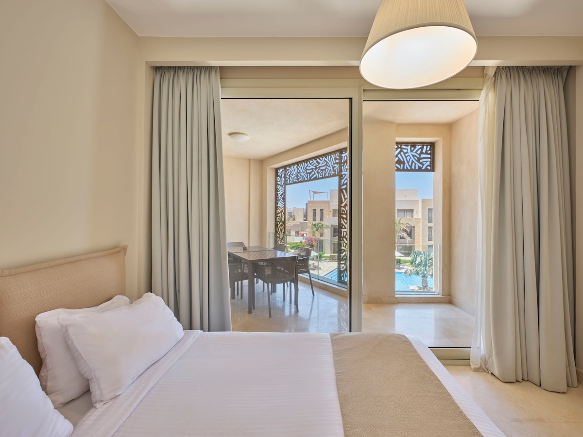 Fully furnished 2 bedroom apartment with 2 balconies with views over the pool. Gym on site . The apartment is supplied with everything for longer stays, full kitchen, hob, washing machine, air fryer, microwave. Air conditioning in every room. Smart TV, Vodafone pay as you go WiFi so you can work from home. 2 value for money Restaurants with great food, also on site shop, hot tubs are all available on request , all 5 minutes away from beautiful El Gouna, only 20 mins from airport.