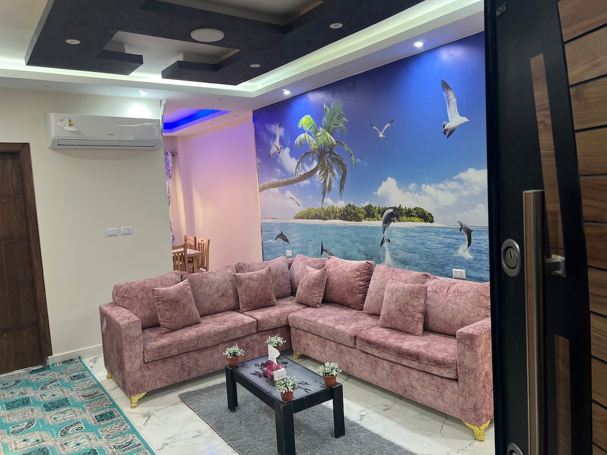 this apartment has 3 wide swimming pools its for kids and adults it has a garden also and a security 24h and there's a free beach 5min walk to there also in the beach there's school surf and u can see colorful coral and fishes then the apartment is nice and cozy theres a living room , 2 balcony, 2 bedrooms ,a kitchen and a bathroom there's also a market near the apartment u can get what you want . in every room there's an ac and wifi also and down the apartment there's free parking .