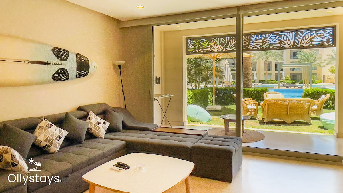 Luxury double-height 1 bedroom oasis w/ panoramic pool views in G-Cribs, El Gouna. Unique architectural gem feels spacious w/ soaring ceilings, modern chic décor. Overlooking crystal pools & lush gardens from first-floor balcony. Smart TV, concealed AC, queen bed + sofa bed, full kitchen, luxury bathroom. Wake to sunlight streaming through huge glass sliding doors. Moments from Red Sea beaches. Book now for unforgettable Red Sea retreat. No Smoking inside - Smoke in the balcony!