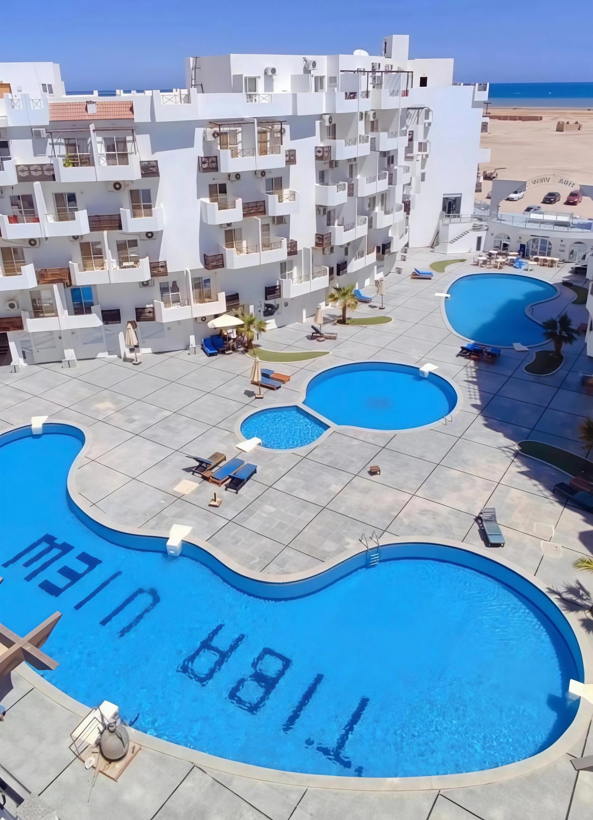 Hurghada holidays - enjoy your stay in modern, beach front, super spacious 90 sqm 1BR apartment with open plan kitchen and living area, fully furnished with all essentials for your comfortable stay in Hurghada. Big balcony give you the best direct sea/pool views and is ideal place to watch a magical sunrise. Private beach, sun beds, two big swimming pools, green garden, Wifi 4G internet, 24 /7 security and outdoor parking are included. **Price not included bills for water and electricity.
