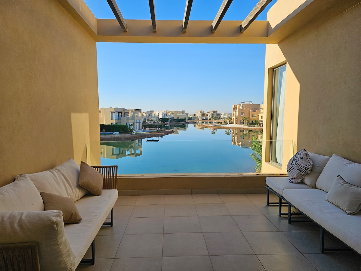 A cozy 2 floors townhouse in West Golf area. Located right in front of one of the longest lagoons in Gouna & overlooking the pool. You simply won't have enough from the stunning view or swimming in fresh or salty waters. The house is in a private quiet area yet less than 5 min by car from Downtown Gouna near all the cafes, restaurants & supermarkets. The house is with high speed internet & all amenities for your ultinate comfort