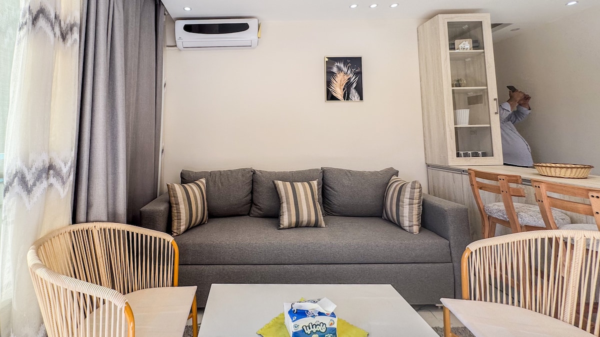 Experience the best of El Gouna with this stunning beachfront apartment. 🌟Everything you need is within walking distance—supermarkets, restaurants, and more! 🏖 Enjoy direct access to Mangroovy Beach, along with its variety of dining options. 🚗 Free parking within the gated compound. 🏄♂️ Kitesurfing center at Mangroovy Beach – Learn or ride with your own gear! Per local regulation, mixed-gender of Egyptian citizens are not permitted.