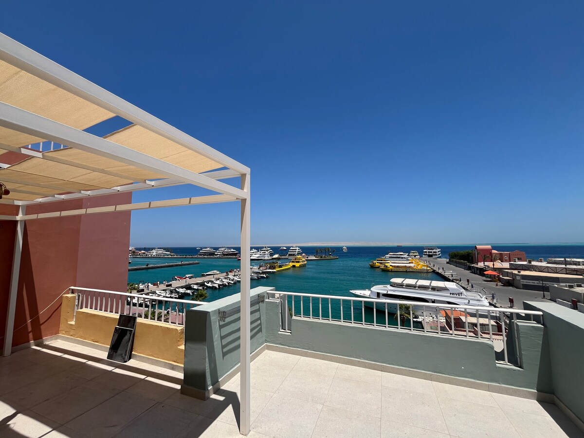 Luxury apartment with sea view in privacy compound in city center, with one bedroom has a king bed with balcony, full equipped kitchen, small living room with a big couch. The apartment is suitable for 3 adults or 2 adults with 2 kids, nice beach with amazing snorkeling area, 3 swimming pools, safety and has security's team, 500 meters from Marina yachts. several restaurants, and coffee around to make your visit easy to plan 😉. providing transfer, trips, entertainment activities services 😉
