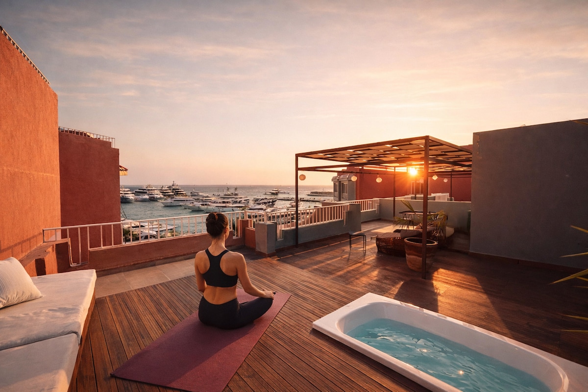 Modern-Retro Penthouse in der Hurghada Marina • 100 m² Dachterrasse mit Sonnenaufgangs-Blick, Esstisch & Sonnenbett 🌅 • King-Size-Bett, QLED Smart-TV, Bose-Soundsystem, French Press • Voll ausgestattete Küche, begehbarer Kleiderschrank, Regendusche • Direkt an der Marina-Promenade mit Cafés, Restaurants & Nachtleben • Kostenloses Parken direkt vor dem Haus Ideal für Paare, Kreative & Designliebhaber. Ein echtes Juwel am Roten Meer! ✨