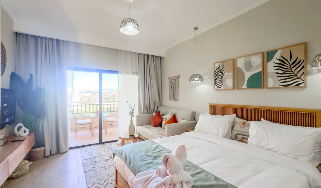 Luxury Studio with Sea View | Near Marina & Restaurants Stay in a luxury 53 sqm studio in central Hurghada – just minutes from Marina, Sheraton Street, and all major attractions. Restaurants and cafés are right across the street from the resort. Perfect for couples, families, or remote workers. ✔️ King-size bed + sofa bed (sleeps up to 4) ✔️ Fully equipped kitchen, smart TV, balcony with sea & pool view ✔️ Access to pools, gym, beach, snorkeling area ✔️ 24/7 security, optional services