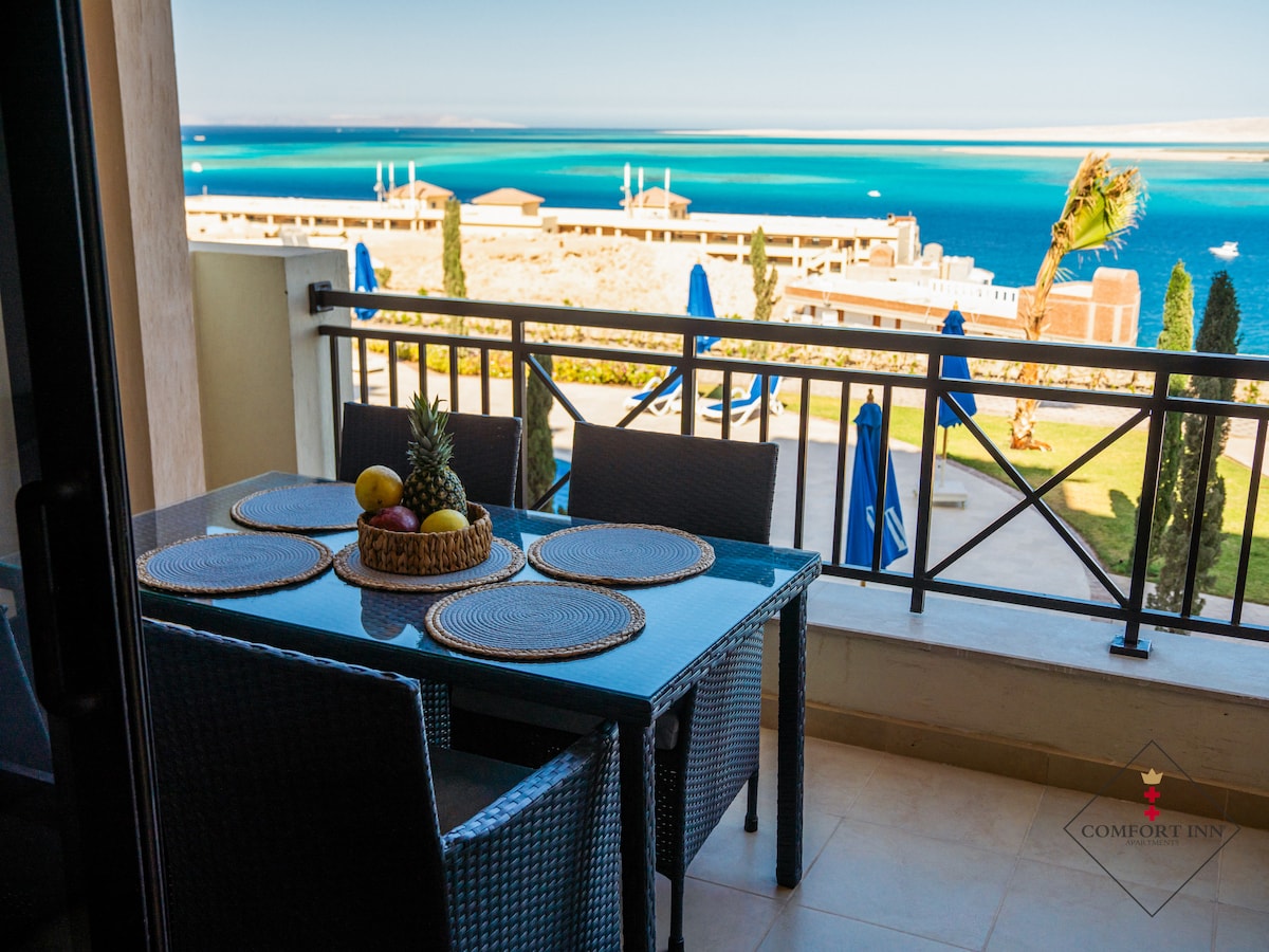 One of very few "full sea view" apartments in El Gouna If you want to enjoy a charming Sea view from bedroom, living room, or even the kitchen then this is the place you are looking for 1 min. walk to the beach 1 minute walk to the huge swimming pool 3 min. walk to the kiting club Relax and have a swim in the private beach or any one of many of the largest swimming pools in El Gouna. Free beach & free swimming pools Access