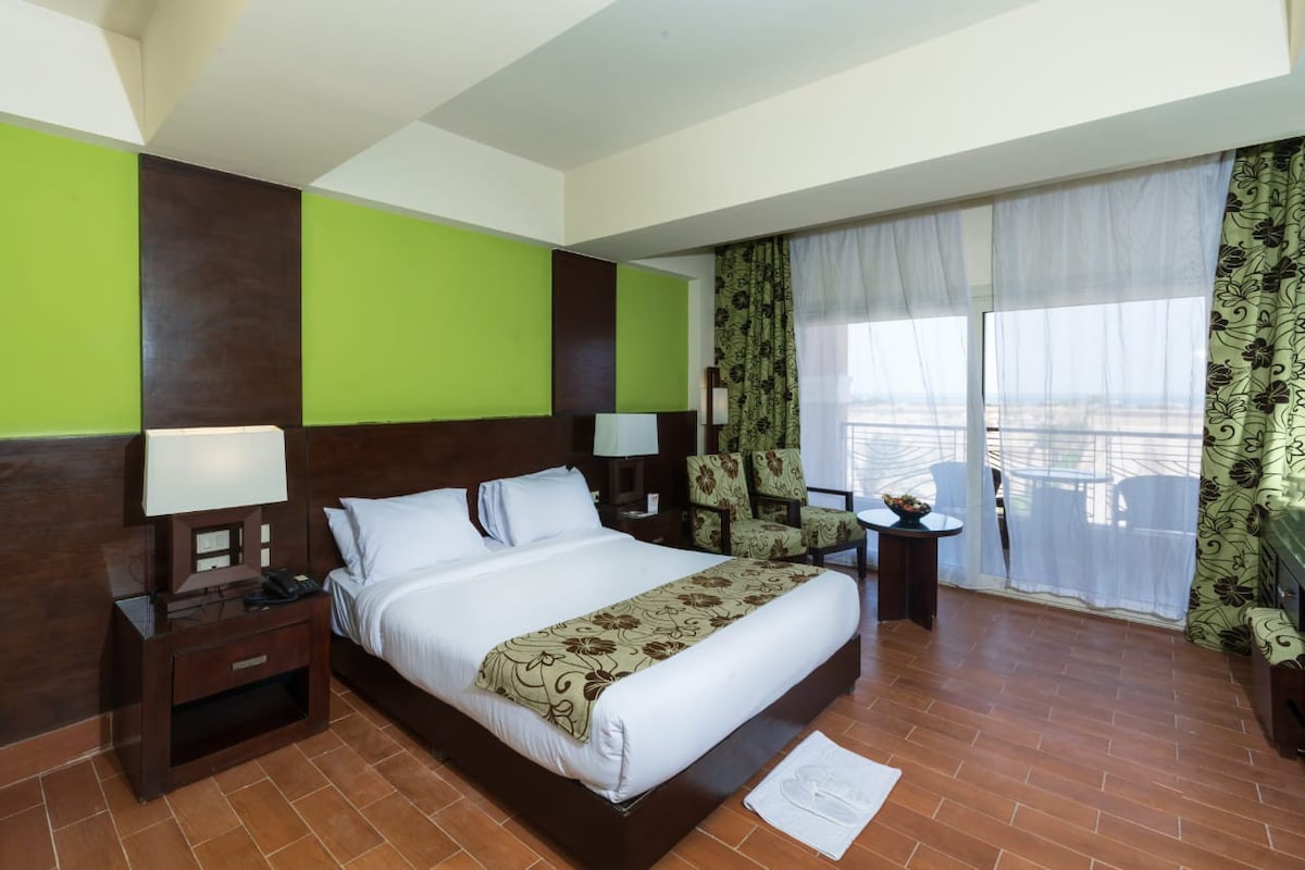 Cozy, clean studio for 2 in a villa guesthouse in North Golf, El Gouna, minutes to Downtown and right by the GoBus station. Full access to the pool and lounge area that has wide views of the golf course and lakes right in front, with Steigenberger Golf Resort in sight. A/C, private bathroom, and kitchenette, ideal for couples or solo travelers. Good to know This is a guesthouse on a villa property, and the pool + outdoor areas are shared within the villa.