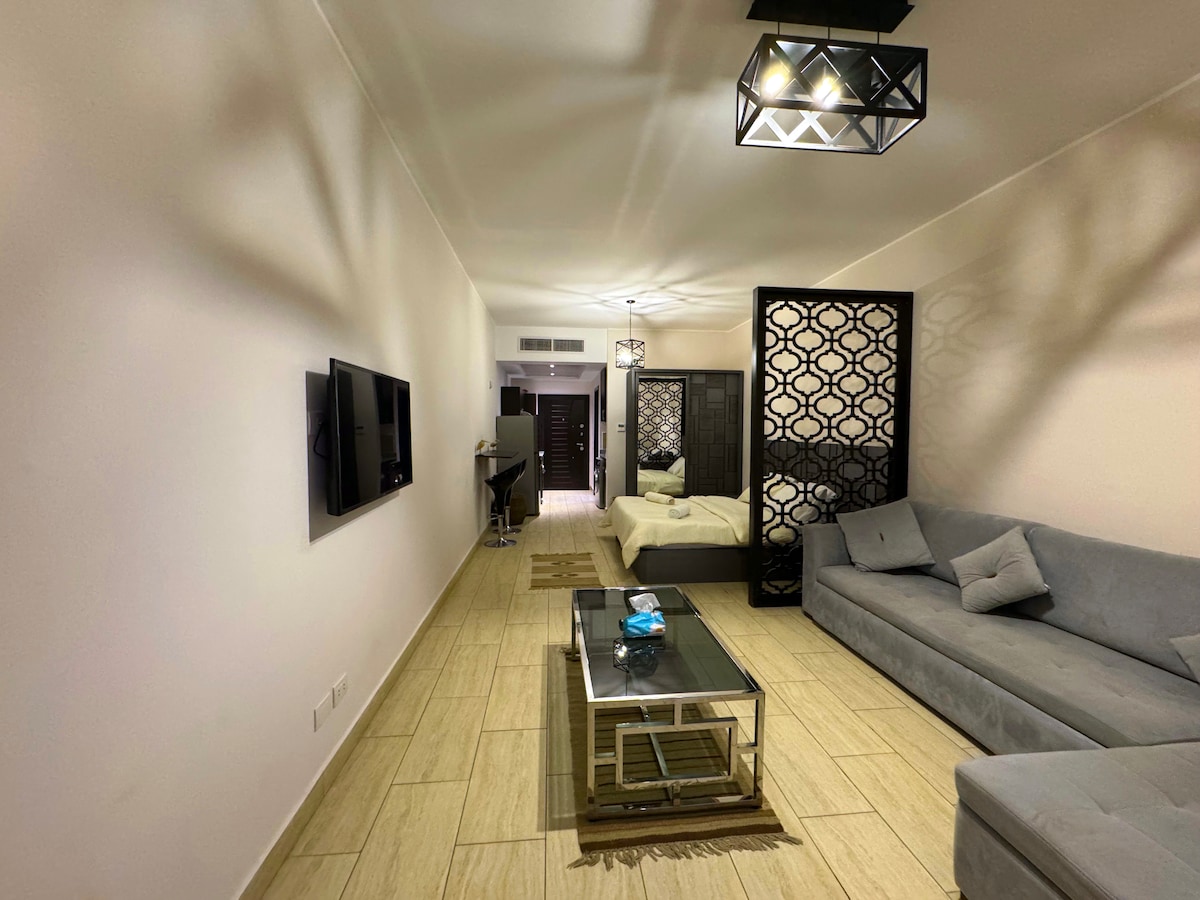 The warmth and relaxing atmosphere in this particular studio is guaranteed to reduce your stress and anxiety. Unwind at the end of the day. Dim the lights, listen to music, pull back your sheets, and make your bedtime feel special. Modernly furnished studio apartment with a breath taking pool view on the 5th floor. Al-Dau Heights is an awesome residential complex with a very close proximity to the touristic promenade.