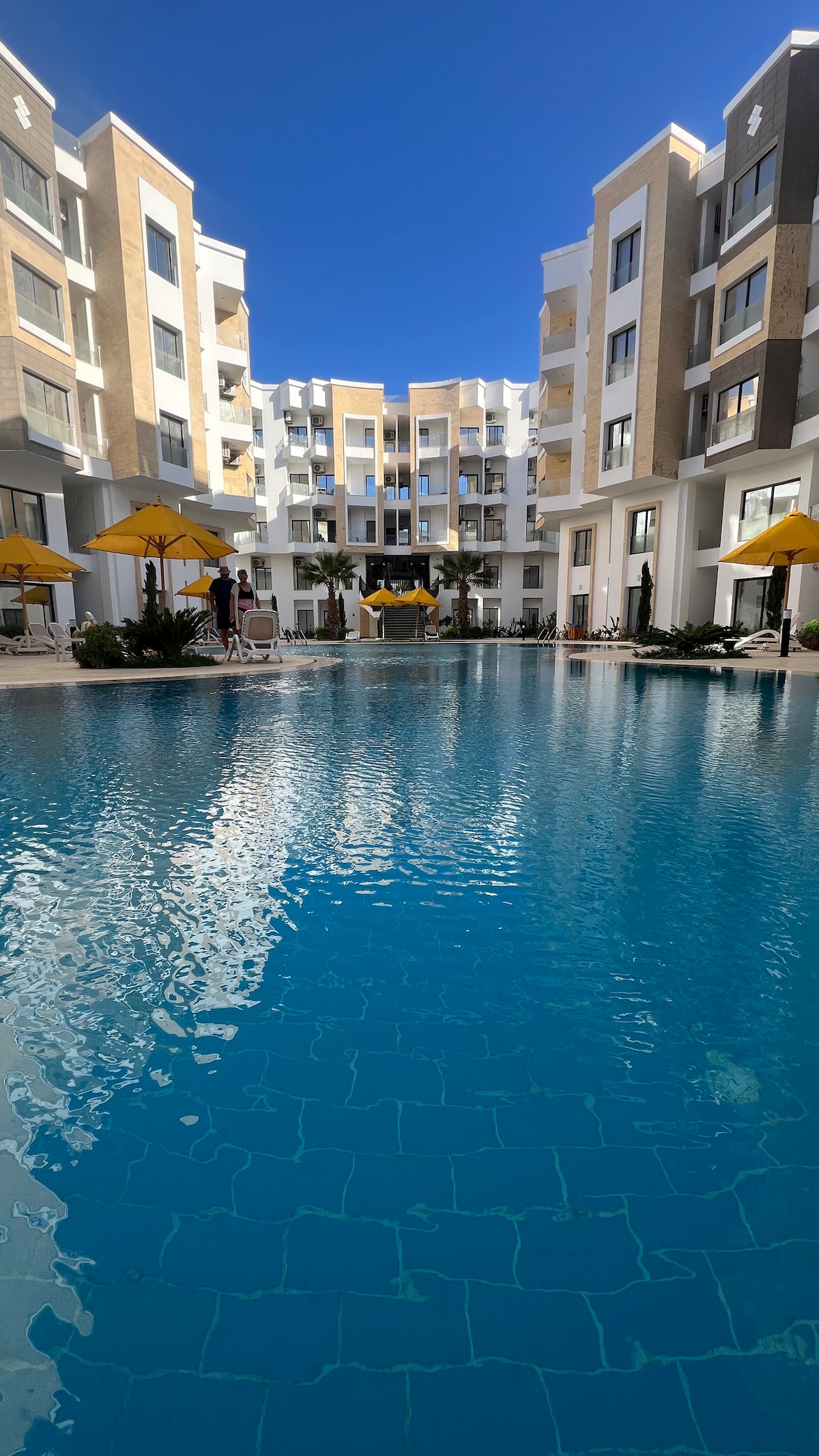 Fully furnished 2 bedroom apartment with 2 balconies with views over the pool. Gym on site . The apartment is supplied with everything for longer stays, full kitchen, hob, washing machine, air fryer, microwave. Air conditioning in every room. Smart TV, Vodafone pay as you go WiFi so you can work from home. 2 value for money Restaurants with great food, also on site shop, hot tubs are all available on request , all 5 minutes away from beautiful El Gouna, only 20 mins from airport.