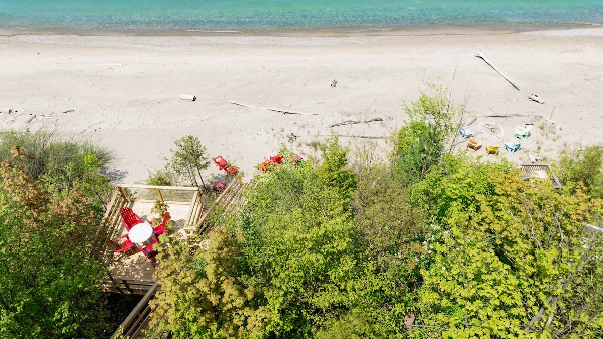 Escape to this charming, stylish retreat where you can truly unwind. The cozy, serene space invites you to relax, while the backyard stairs lead directly to a private beach. There, you can bask in the sun, swim, play games, or gather around a bonfire. Nestled on Lake Huron just north of Bayfield, you’ll be treated to some of the most breathtaking sunsets in the world.