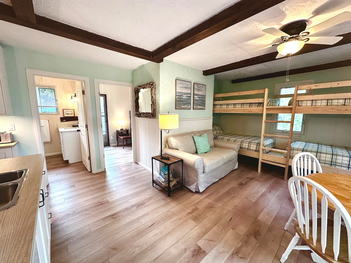 Welcome to The Nest at The Beach House - your private retreat on Lake Huron. This cozy guest suite offers a family or couples getaway at our lakefront cottage. It features a queen bedroom and a living area with two (2) bunk beds and a kitchenette. Spend your days on our private beach, swimming and relaxing, then dine outdoors on one of two decks with lake views and a BBQ. End your evening cliffside in Muskoka chairs with a bonfire, your favourite beverage, and breathtaking sunset.