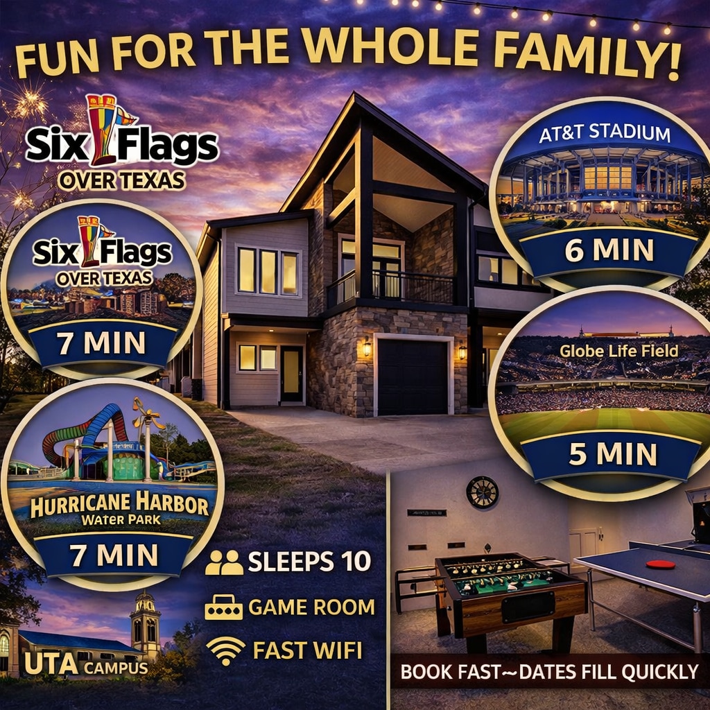 🔸 10 min walk to AT&T Stadium, Globe Life Field, Choctaw Stadium, Arlington Convention Center, Medal of Honor Museum, Texas Live & Esport Stadium 🔸 5 min to UT Arlington, Six Flags & Hurricane Harbor 🔸 15 min to DFW & Love Field airports 🔸 20 min to TCU, SMU, Stockyards HOME AMENITIES 🔹 Hot tub 🔹 Pickleball court 🔹 Basketball court 🔹 Firepit 🔹 Outdoor cabana 🔹 Weber BBQ 🔹 TV streaming 🔹 Memory foam mattresses 🔹 Baby-friendly items 🔹 500 mbps wifi 🔹 Fully stocked kitchen