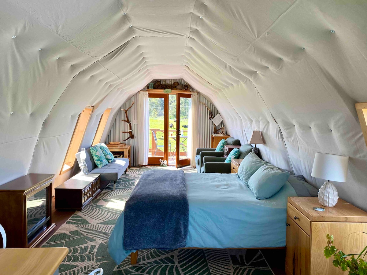 On a quaint country road with views of the Olympic mountains to the south and the Salish sea to the north you will find a 5 acre sheep farm that we call (with a nod to the Scottish tradition) the Crofts. Our Katmoget Croft is light and airy with high ceilings, quirky decor and windows on all sides that frame the pastoral surroundings. It features a well-appointed kitchen with bar seating, comfortable queen bed, flat screen tv, starlink internet, and large patio/outdoor living area.