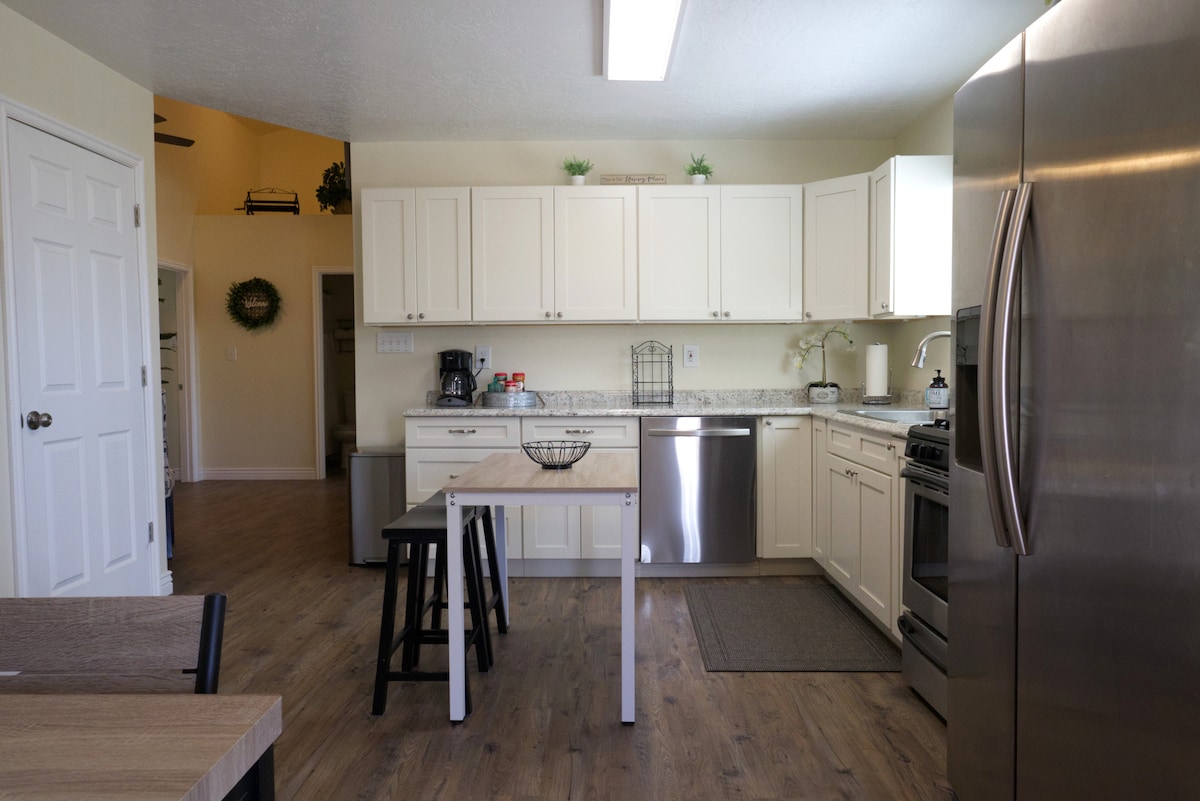 Relax in the hot tub with sweeping mountain views at this newly finished basement apartment with private entrance. Two bedrooms: a master with a comfy king bed plus a fun bunk room with a twin-over-QUEEN bunk (high-quality bedding!). Smart TVs in both bedrooms + living room. Open, spacious layout with fully stocked kitchen, full bath + double vanity. Games & books included—great for families, friends, or couples. Close to Zion, Bryce Canyon, Grand Canyon, Water Canyon & Coral Pink Sand Dunes.