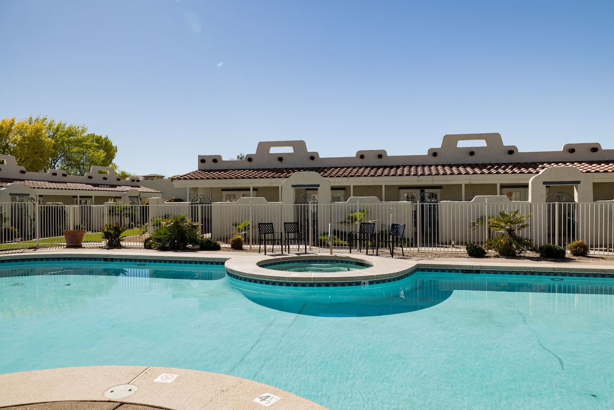 *Pool and jacuzzi temporary close-opens on January 16** This gorgeous Spanish Colonial destination is exactly what you need for complete relaxation. Featuring 1 King size bed and a sofa sleeper (sleeps 4), 1 bathroom with a washer and dryer, beautiful walk in shower, fireplace, living room, private patio with a full kitchen, BBQ grill on patio.