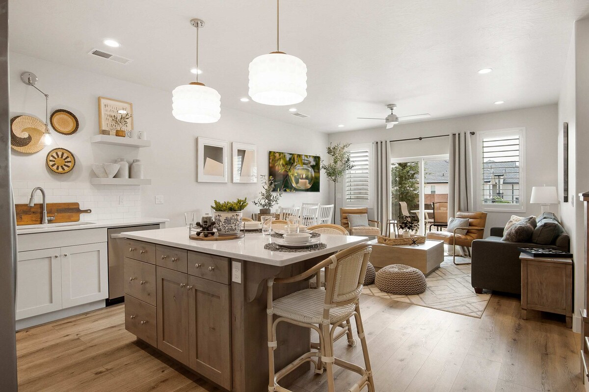 Luxury home located near Zions, Snow Canyon, and Sand Hollow. It has 4 Bdrms, 3.5 Bath, and sleeps 20 guests including a 9-bed bunkroom. We pride ourselves with our comfortable beds! Equipped for a home-cooked meal and grilling by the pool. Watch a movie from the private pool and enjoy an indoor/outdoor experience. Kids will love pingpong, skeeball, pickleball courts, and community pools. Relax by our rooftop firepit and roast some mallows. A vacation experience you will always remember!