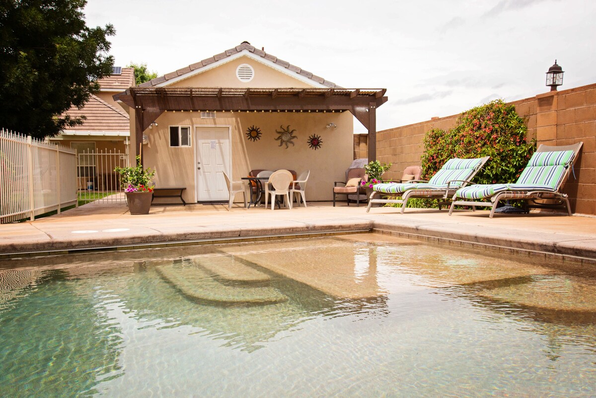 Enjoy this spacious studio style private guest house behind our home. Includes family room, kitchen facilities, king size bed, Wifi and Direct TV, private entrance, beautiful backyard, BBQ grill. Refreshing pool available (May 1st -Oct.15th). Located in a quaint town with grocery stores and restaurants nearby. 20 Mi. from Zion National Park 20 Mi. from St. George 130 Mi. from Bryce National Park 130 Mi. from North Rim of the Grand Canyon 10 Mi. Sand Hollow Reservoir