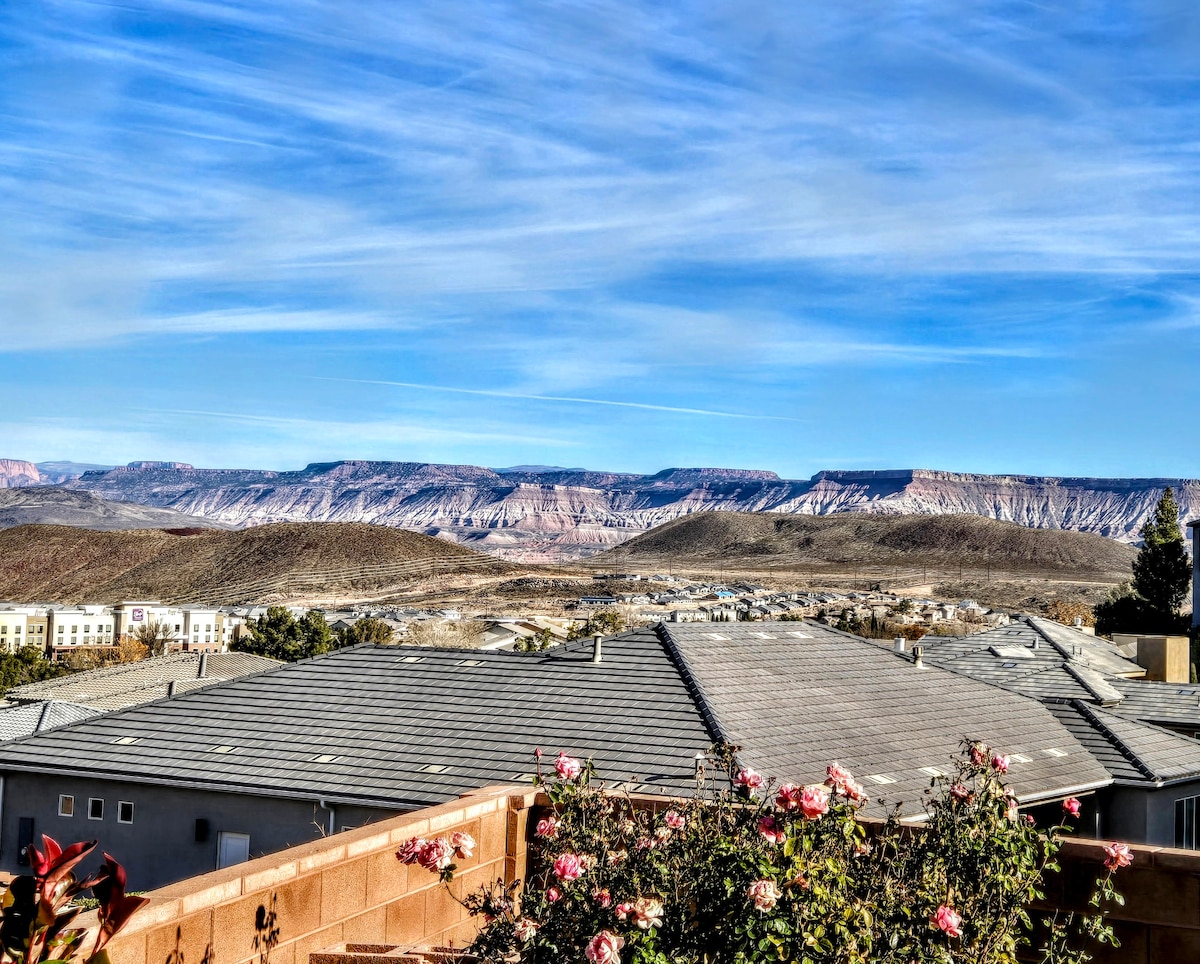 HOT TUB, ZION, ATV, GOLF- Enjoy nice views of Hurricane Cliffs, Valley & Pine Mtn from your 1100sqft private studio on the lower level. Peaceful setting 8 minutes from town at the foot of the beautiful Hurricane Cliffs. Enjoy your private patio & tiki hot tub. There are hundreds of miles of trails for ATV riding from the house. Copper Rock championship golf course is across the street. Zion NP is 27 miles away. Secure safe parking. No pets or dogs. Please note: the studio is not ADA equipped.