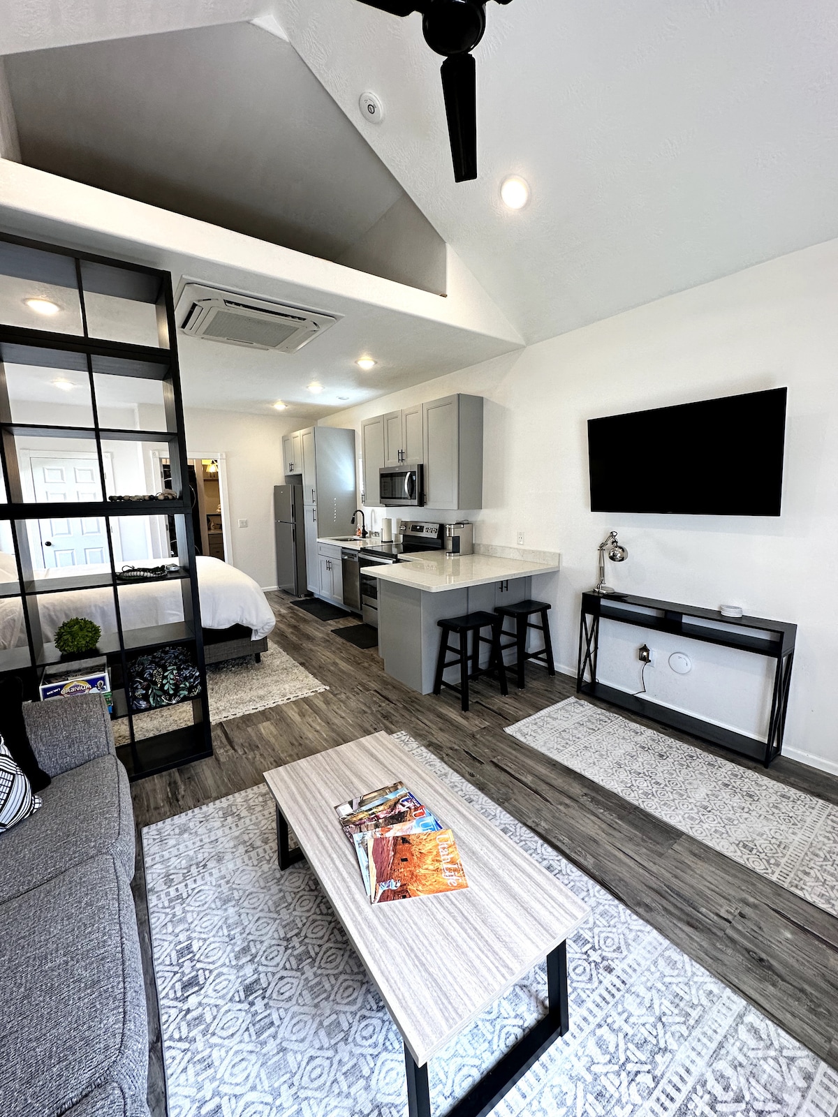 After a day of adventures, come recharge and relax in this calm, stylish space! Intention and attention to detail was poured into this home away from home. From the start of the day to the very end, this Bryce Canyon themed 1-bed, 1-bath casita has all of the amenities a couple travelers need, including stackable washer and dryer (laundry pods too), microwave, mini fridge, dishware, and TV with Netflix. Centrally located with convenient access to Sand Hollow, Quail Creek, Snow Canyon, and Zion.