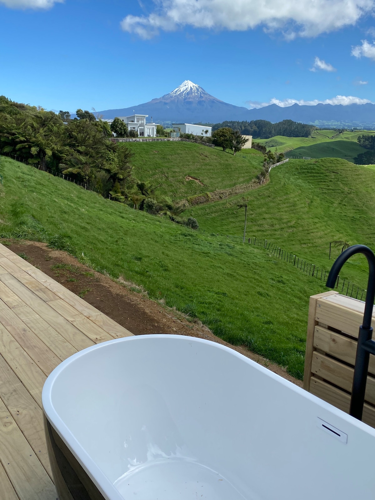 The EcoBach is a guest favorite for its stunning views of Mount Taranaki, peaceful atmosphere, and off-grid charm. Guests love relaxing in the outdoor bath, exploring the property’s gardens, glowworms, and friendly animals, and enjoying the cozy, well-equipped interior with books, games, and movies. Just 15–20 minutes from New Plymouth and near Egmont National Park, it’s perfect for couples or families seeking a tranquil retreat with sustainability and modern comforts in harmony.