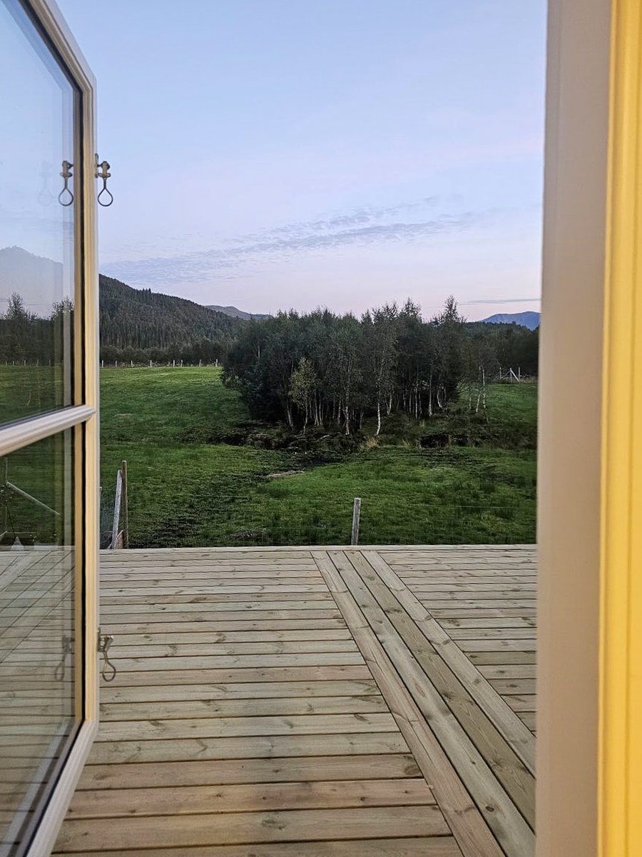The cabin is located in the forest, it has a view of the mountains and the fjord. From the right side of the terrace you can walk to the fjord. There are two grills on the plot, one gas and the other wood-fired. When the weather is nice, you can have a nice time outside, and when the weather is bad, it's very cozy to light the fireplace and watch nature from the inside.