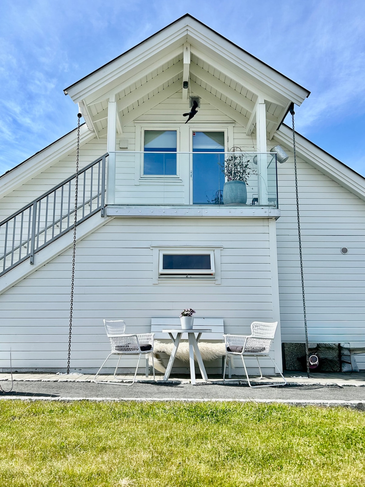 Dyrevenlig koselig overnattingssted med sentral beliggenhet 700 m fra Skjærhalden sentrum. Leiligheten ligger over en garasje. Stor usjenert plen med hagemøbler og grill. Her er det lov med hund. Leiligheten er fult møblert, også sengetøy og håndklær. Babyseng og barnestol tilgjengelig. Det er 4 sengeplasser i leiligheten. Det er også mulighet for å sove på sovesofa i stuen. Men egner seg best til 4 personer