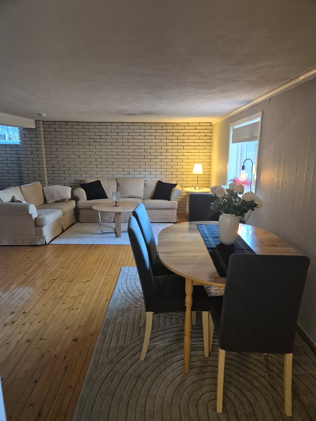 Dyrevenlig koselig overnattingssted med sentral beliggenhet 700 m fra Skjærhalden sentrum. Leiligheten ligger over en garasje. Stor usjenert plen med hagemøbler og grill. Her er det lov med hund. Leiligheten er fult møblert, også sengetøy og håndklær. Babyseng og barnestol tilgjengelig. Det er 4 sengeplasser i leiligheten. Det er også mulighet for å sove på sovesofa i stuen. Men egner seg best til 4 personer