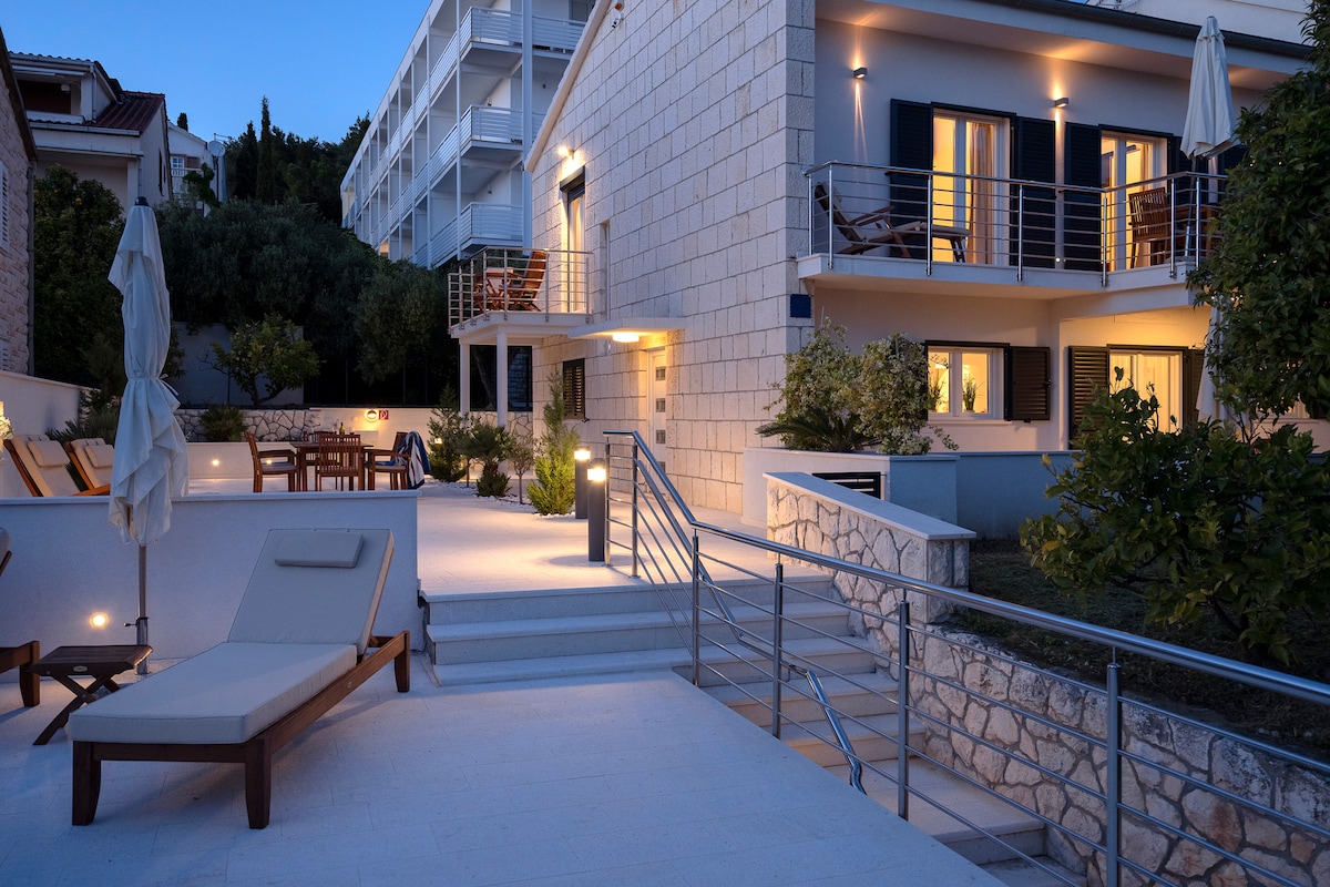 Old stone house, consisting 2 separate apartments, which we have completely and lovingly renovated with the highest quality materials. The outdoor area is designed with white stone from the island Brac (like the pillars of the „White House“). Teak furniture and also a BBQ are available to our guests.