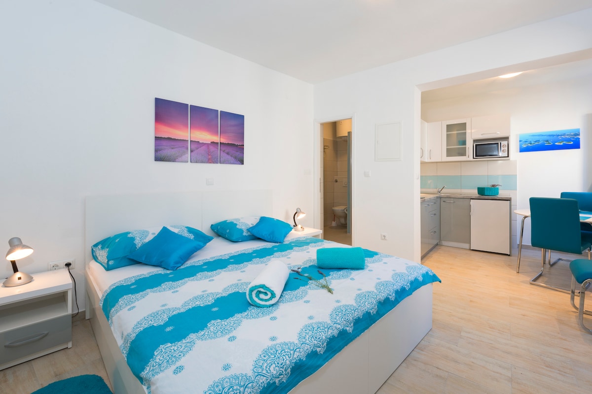 Apartman površine 60 m 2 sastoji se od spavaće sobe sa velikim bračnim krevetom, kupaone, prostrane dnevne sobe sa kuhinjom, predsoblja i balkona. Čitav južni zid prema moru je u staklu tako da prostor ima puno svjetla i sa balkonom čini jedan prostor. Apartman se nalazi na trećem katu kuće koja se nalazi u neposrednoj blizini centra grada (5 minuta ugodne šetnje uz more) te sa balkona ima otvoreni pogled na more i otoke budući se kuća nalazi u prvom redu uz more.
