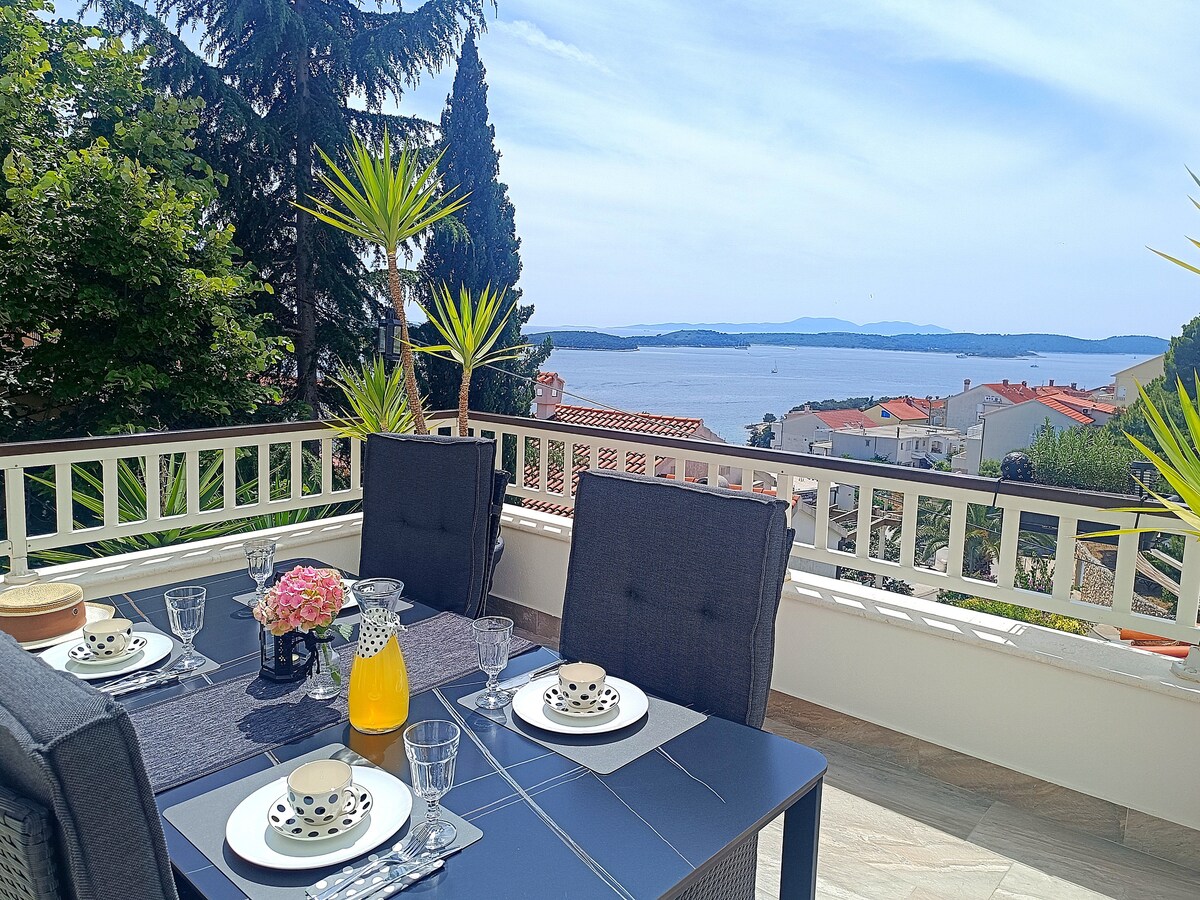 1 bedroom apartment,spacious, ideal for couples. Apartment is located in West,peaceful and secluded part of town, yet close to beaches, grocery store, sports center, diving and spa center. It has an amazing, panoramic sea view to nearby Paklinski islands and sea. Ideal for guests who prefer privacy and good night of rest away from hustle and bustle of center of town..