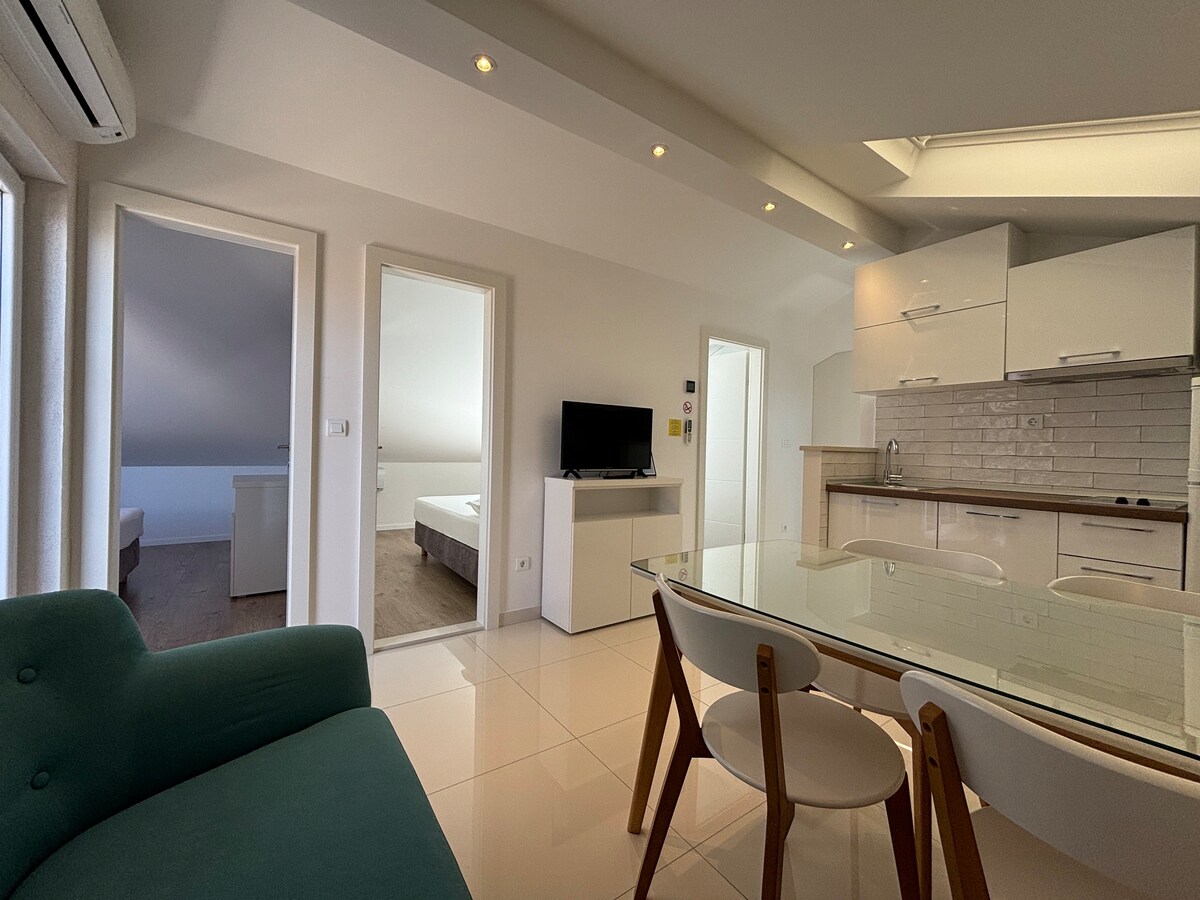 You will enjoy this beautiful and artistically decorated apartment. Apartment is newly furnished and perfect for couples. It has balcony, see view and amazing look on beautiful sunsets ,and consists of kitchen with dining room, room and a bathroom. Apartment has a good location, just a few minutes walk from town center, clubs and beaches.