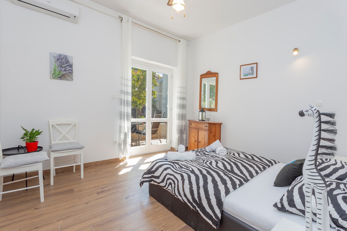 Cozy apartment for two on the second floor located in a very quiet area above the pine wood. The view is beautiful, you can see the sea between the pine trees and our garden full of green. All necessary facilities are close. Restaurants, groceries, rent a boat and bikes are within two minutes of walking distance, the sea is in front of the house . The walk to the city centre takes less than five minutes by the sea and walls of the old Franciscan monastery.