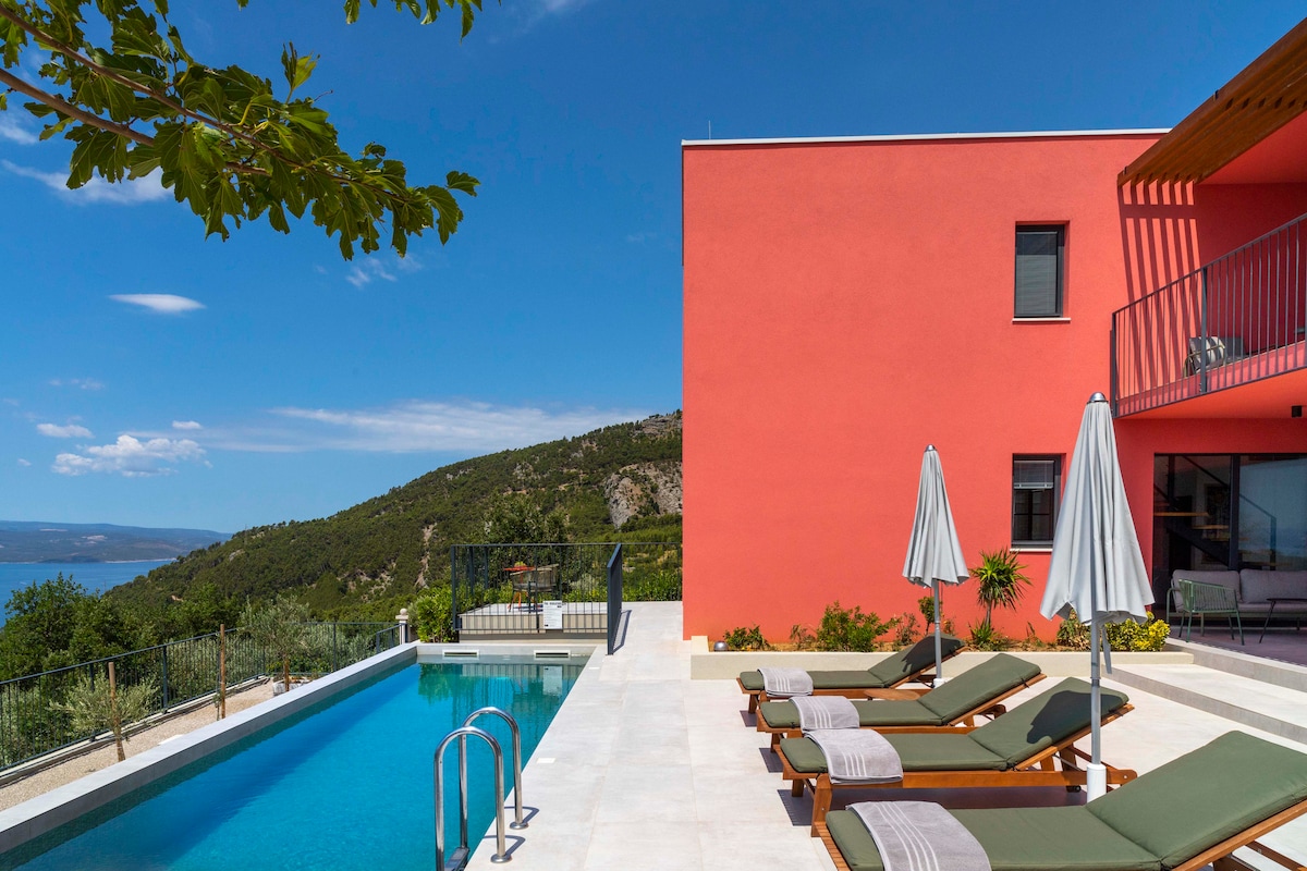 Modern holiday house Villa View with the heated infinity pool at the foot of the mountain Biokovo and its park of nature.Villa is situated in a wonderful, quiet and natural environment with pine trees and olive fields.On the ground floor is located the beautiful heated infinity pool with massage (33 m²),from which you have a breathtaking panoramic view of the town of Makarska,the sea and the island.You will want to stay forever in this modernly equipped villa with Jacuzzi and fitness room.