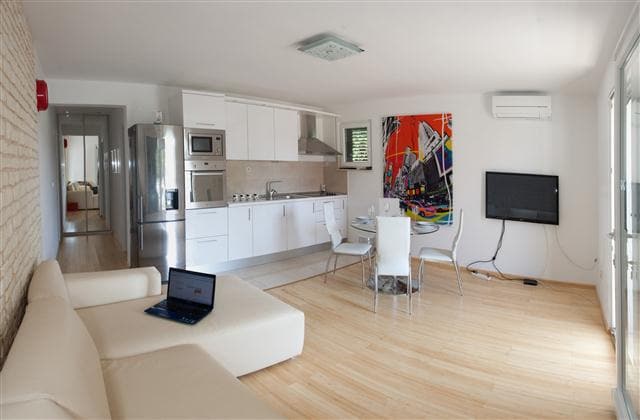 Apartman površine 60 m 2 sastoji se od spavaće sobe sa velikim bračnim krevetom, kupaone, prostrane dnevne sobe sa kuhinjom, predsoblja i balkona. Čitav južni zid prema moru je u staklu tako da prostor ima puno svjetla i sa balkonom čini jedan prostor. Apartman se nalazi na trećem katu kuće koja se nalazi u neposrednoj blizini centra grada (5 minuta ugodne šetnje uz more) te sa balkona ima otvoreni pogled na more i otoke budući se kuća nalazi u prvom redu uz more.