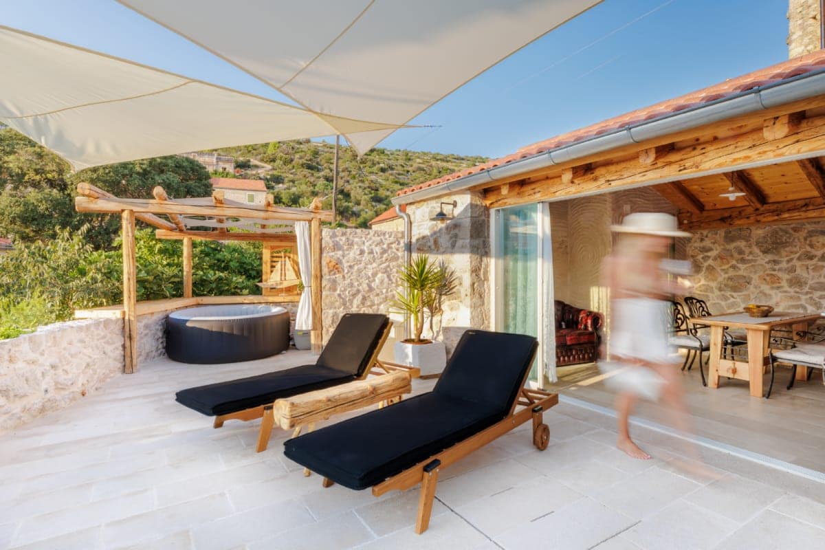 We are delighted to offer one of the most unique accommodations in Croatia, in the abandoned eco-ethno village of Humac. Villa dates back to 1880, and it was completely renovated in 2020. The estate consists of a traditional Mediterranean stone house of 160 m2 and a unique garden of 3000m2 fields of lavender and immortelle that provides complete privacy and peace. g This is a fully equipped 4 bedrooms and 5 bathrooms villa with a large terrace with hot tub and amazing sunset views