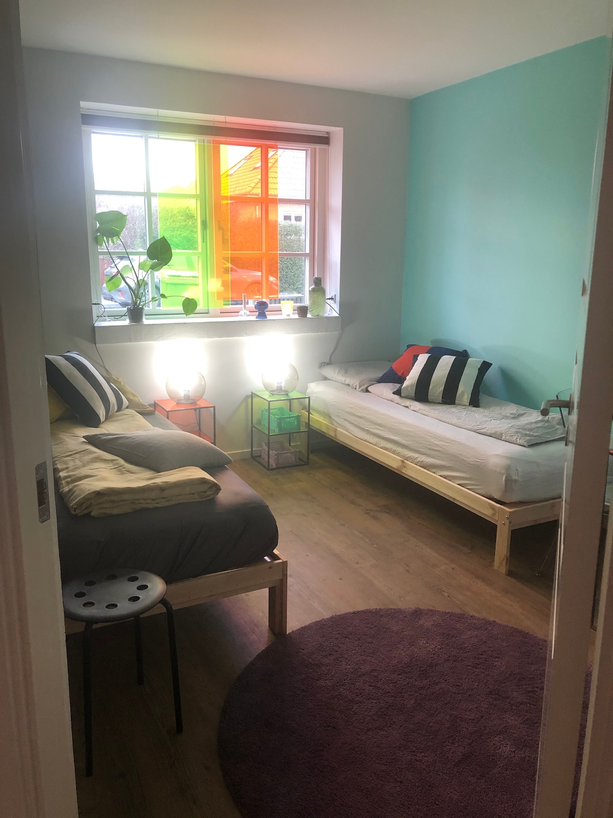 The first word that comes to mind is "hygge" – the Danish word that means "cozy". You instantly feel at home and the colors gives you a warm, happy feeling. A lot of things are tailor-made; and Trine, the artist who designed the room is, coincidentally, a tailor. The beds can be easily put together – just let me know once you arrive. Dogs/animals are welcome. Includes organic, homemade self-service breakfast.