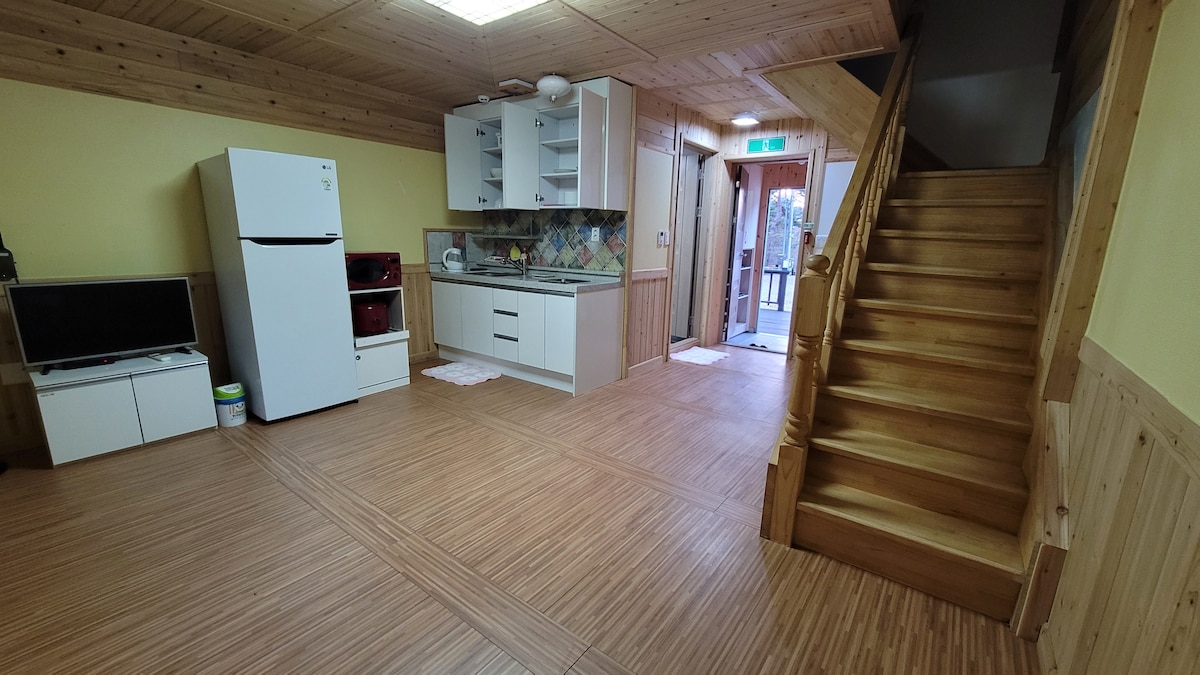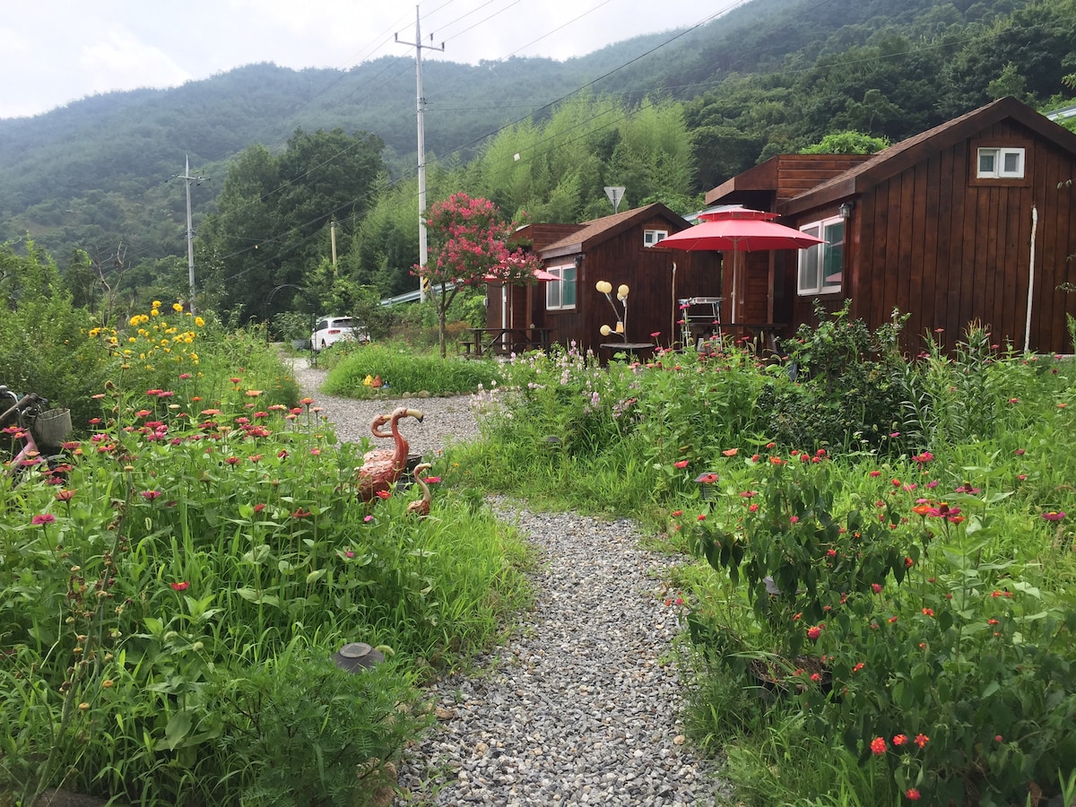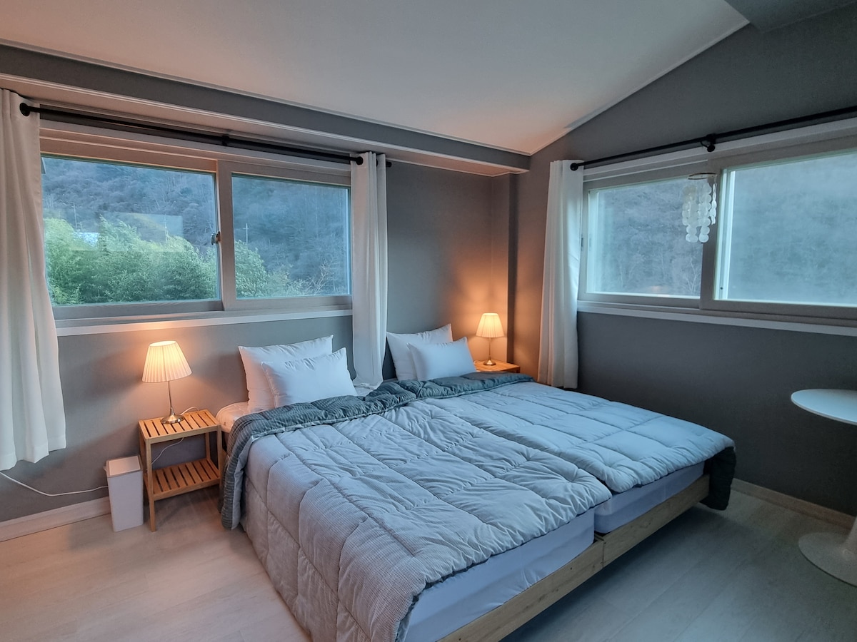 숙소안으로 들어가면 아늑하고 감성 분위기 거실과 깔끔한 주방 안쪽으로 들어가면 2023.1월에 확장공사한 넓은 침실과 따뜻하고 밝은 분위기에 통유리 밖으로 보이는 산속뷰가 힐링에 시간을 만들어 드려요~ 아늑하고 조용한 곳으로 자기의 시간을 즐길수 있으며 숙소옆 작은 계곡에는 다슬기와 피리 작은 물고기가 있어 재밋게 놀수 있어 행복합니다. 봄에는 쑥과 봄나물을 캐는 재미가 즐겁습니다. 넓은 잔디마당을 아이들 반려견과 함께 힐링여행이 될수 있어요~
