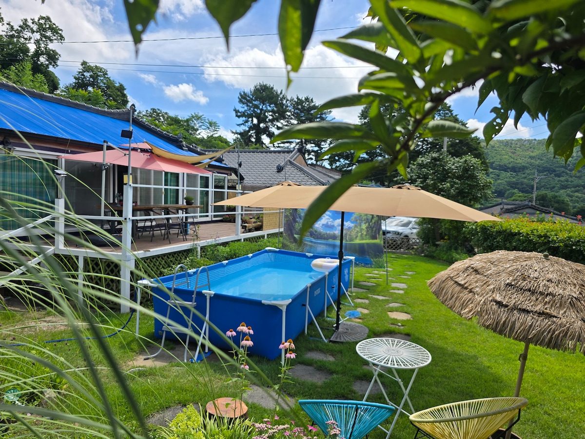 펜션형식의 민박, 2019년 전원주택 신축, 부속건물로 좌측에 다목적창고(20인석 탁자와 의자 활용 회의나 회식 가능)와 우측에 별채있음. 다만, 30평 독채중 안방 하나만은 게스트의 사용을 제한(다만, 게스트 8명 이상시 개방가능, 호스트는 아랫마을 농가주택 활용). 건물 내부 구조는 아파트 형식(힐체어 이동편리)으로 게스트가 사용할수 있는 공간은 4인실 방2, 거실(침실로 사용할 경우 8인 내외 취침할 수 있음, 응접의자, 49"TV, 에어컨, 빨래건조기, 제습기, 와이파이)1, 주방(가스렌지3구, 전자렌지3구, 6인용 식탁과 의자, 냉장고1, 김치냉장고1, 전기밥솥1, 커피폿트1, 남비 등 각종 주방용품), 화장실겸샤워실(중형세탁기1, 비데1, 세면도구 및 청소도구)2, 보일러실(각 실별 온도조절 가능)1, 창고앞에서그릴과 항아리 바베큐 가능(숯과 석쇠 등 소모품은 게스트 부담). 숙소뒷편에 대형 가스토치1, 대형스텐솥1, 중형세탁기1, 요와 이불은 게스트 인원에따라 배치.