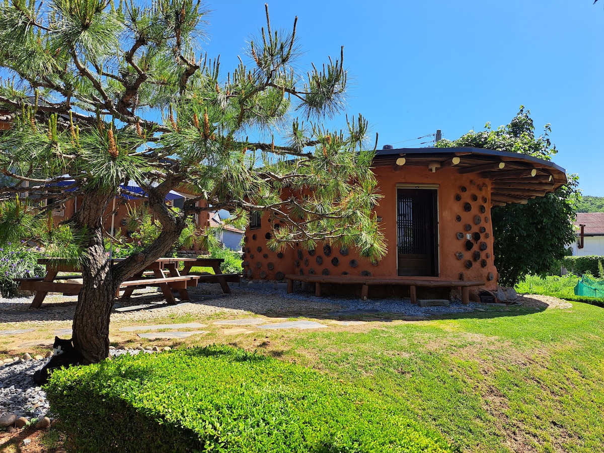 경기 양평 서종 화야산 산 속, 서종IC에서 벽계구곡 끼고 국도 7km 들어오면 왼편으로 황토집 S자 전용도로 올라오면 하늘아래 널은 부지에 나만의 힐링 황토 한옥~ 사계절이 선물인 황토집의 봄엔 달래 냉이 쑥 두릅 피는 산책길 좋고, 여름엔 시원한 계곡 물놀이, 쌈채소와 바베큐, 평상, 해먹 휴식, 가을엔 알밤, 구지뽕, 화야산 단풍 트래킹, 무쇠화로에 모닥불 좋고, 겨울엔 참나무 장작불 황토방 찜질로 온몸이 뜨끈~ 감기가 뚝~ 피로가 싸악~~ 자연과 벗하며 휴식을 취할 수 있는 숨어 있는 나만의 쉼터. 황토집은 국내산 소나무+황토+다시마+숯가루를 숙성시켜 바른 진짜 황토집. 화야산 기슭에 고즈넉히 앉은 황토집은 휴식에 최적. 집 뒤 잣나무 숲길을 지나 청평댐까지 구비구비 펼쳐지는 15km의 트레킹 코스는 누구나 쉽게 즐길 수 있는 숨어있는 명품길. 나만의 시냇물놀이, 잣나무 숲 명상 & 해먹 등 자연은 사계절 모두가 선물.