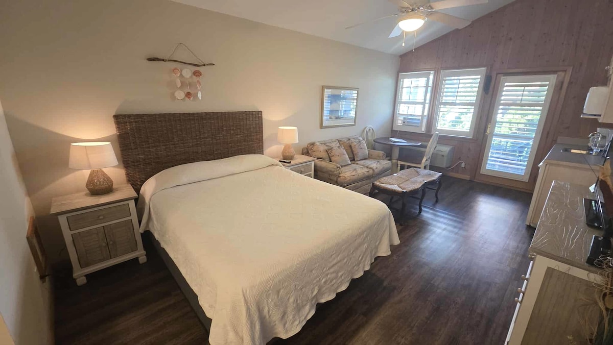 This centrally located 1st floor 1 room Villa has a king & queen bed, full bath with tub/shower and vanity sink. Wireless internet, TV, table w/2 chairs, kitchenette with mini-frig, microwave, coffee maker and sink. Relax in the shared outdoor pool (open April thru October), shared sauna & shower. In addition, there is a shared screened area with observation deck on Silver Lake. Linens & towels are provided (but no beach/pool towels, so please pack and bring.) No smoking, no pets.