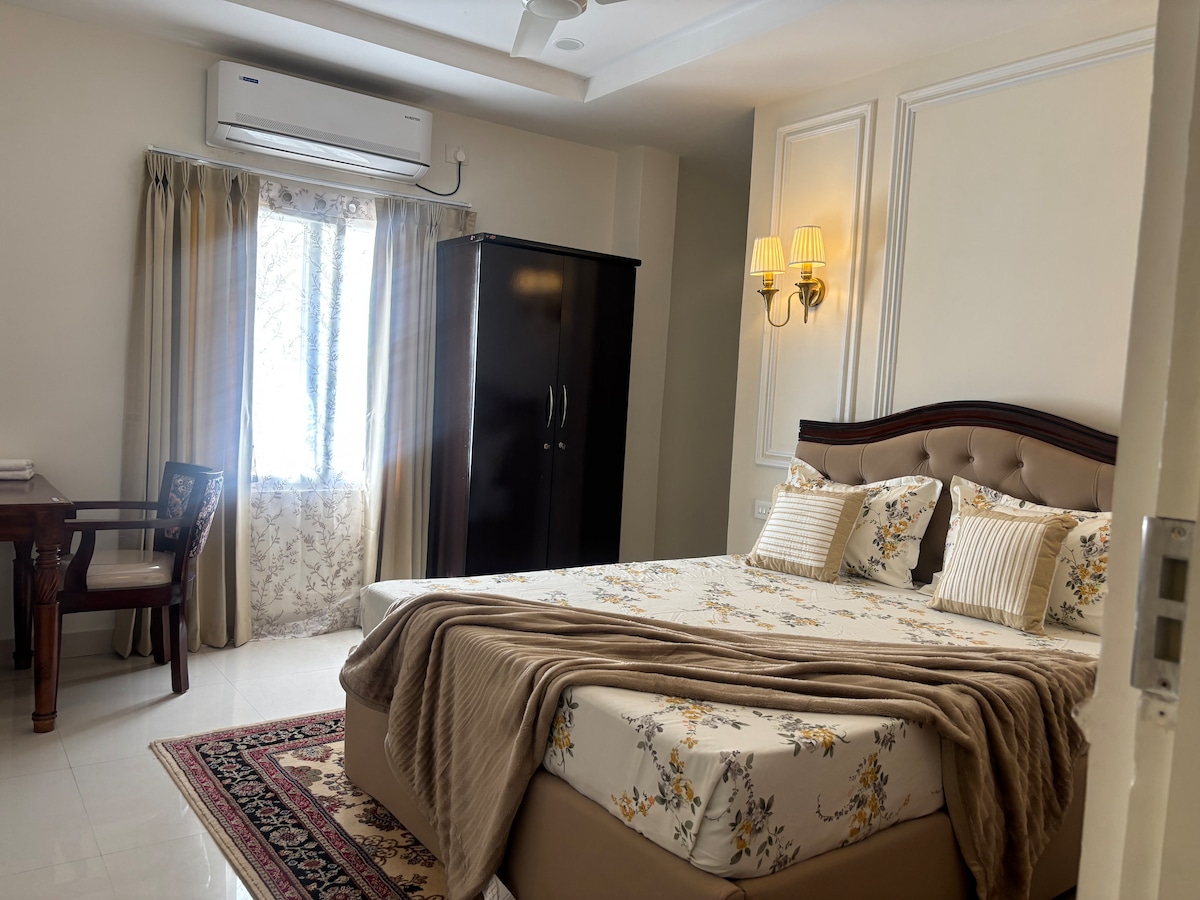 This cozy 2BHK penthouse on the 4th floor offers a peaceful stay with lift access and CCTV surveillance for security. Enjoy the open front area for fresh air and sunlight, while kids can play in the nearby park. Supermarkets and shops are within walking distance. The apartment features AC in both bedrooms, geysers in the bathrooms, high-speed Wi-Fi, and a fully equipped kitchen. A washing machine and iron are also provided, making it perfect for a comfortable and convenient stay.