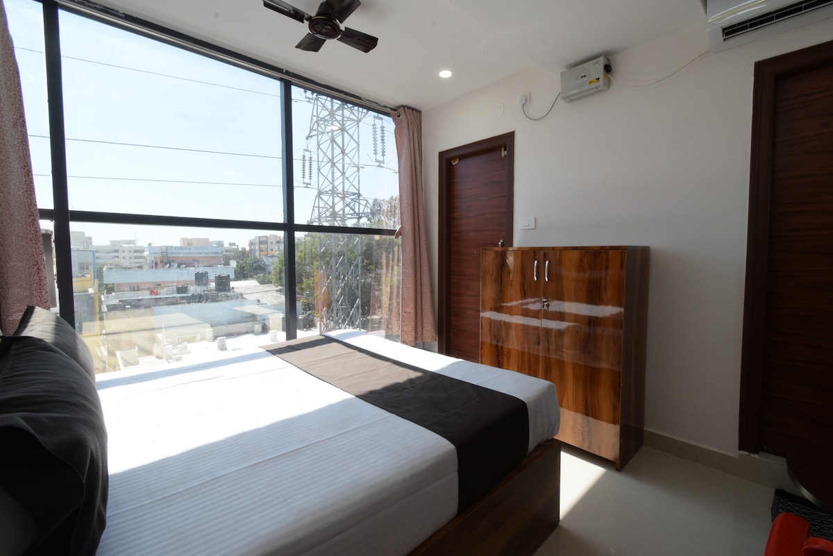 Enjoy a stylish experience at this centrally-located place on the 8 th floor with magnificent views . This has good restaurant downstairs and easy access to ORR (airport ) . Centrally located to major IT companies, Hospitals , financial district and good for travels from across the world with mind blowing interiors .New property with quality .