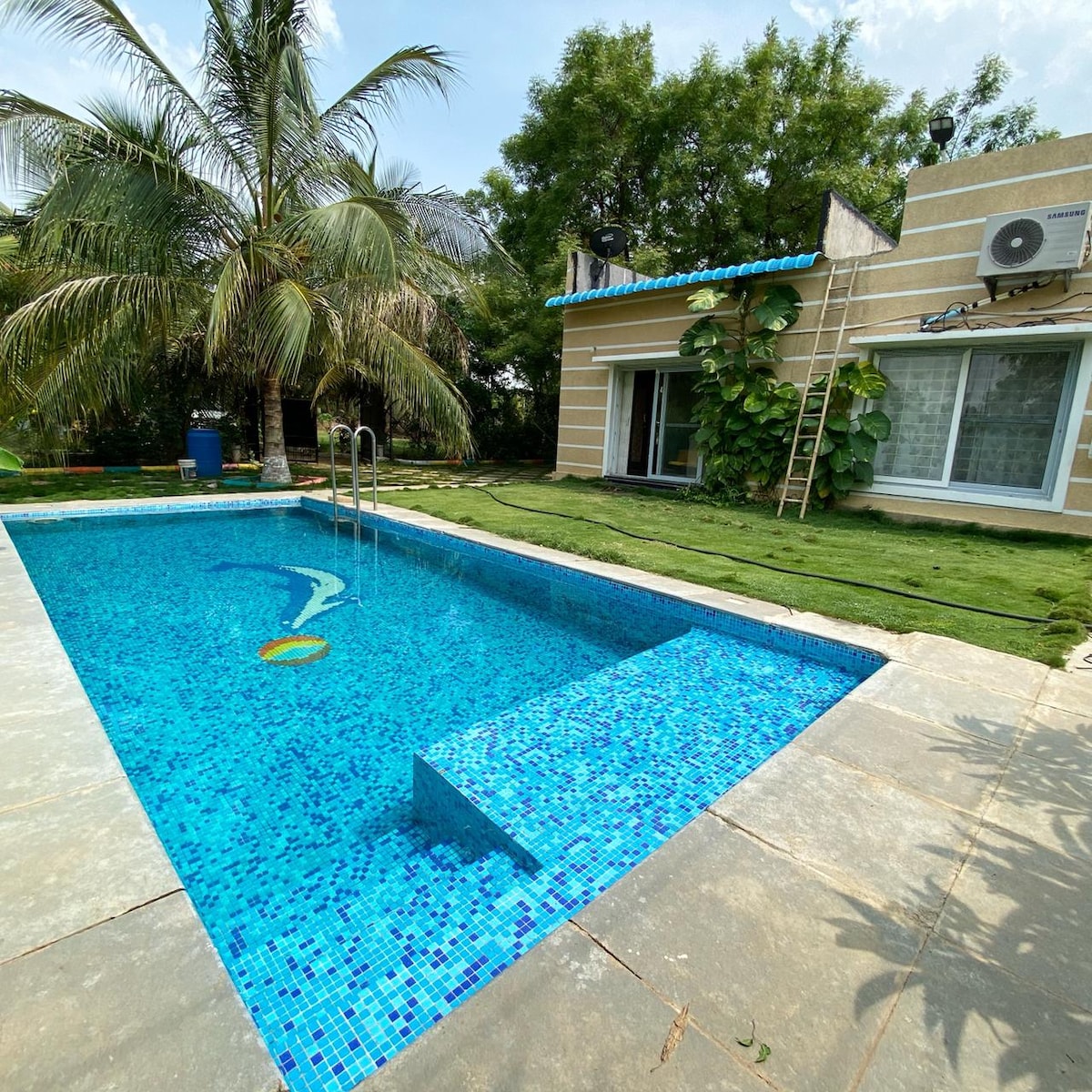 2 acres of beautiful organic farm, and this premium n cozy wooden house with private pool with spectacular picture perfect river view makes your stay super memorable. Super comfortable luxury king bed, huge balcony with attached private pool makes your stay truly memorable. One side you have river view, other side has lawn view. When it comes to activities play badminton with barefoot, take a dip in our freshwater swimming pool or simply bath in river Saradha, net cricket and fishing.