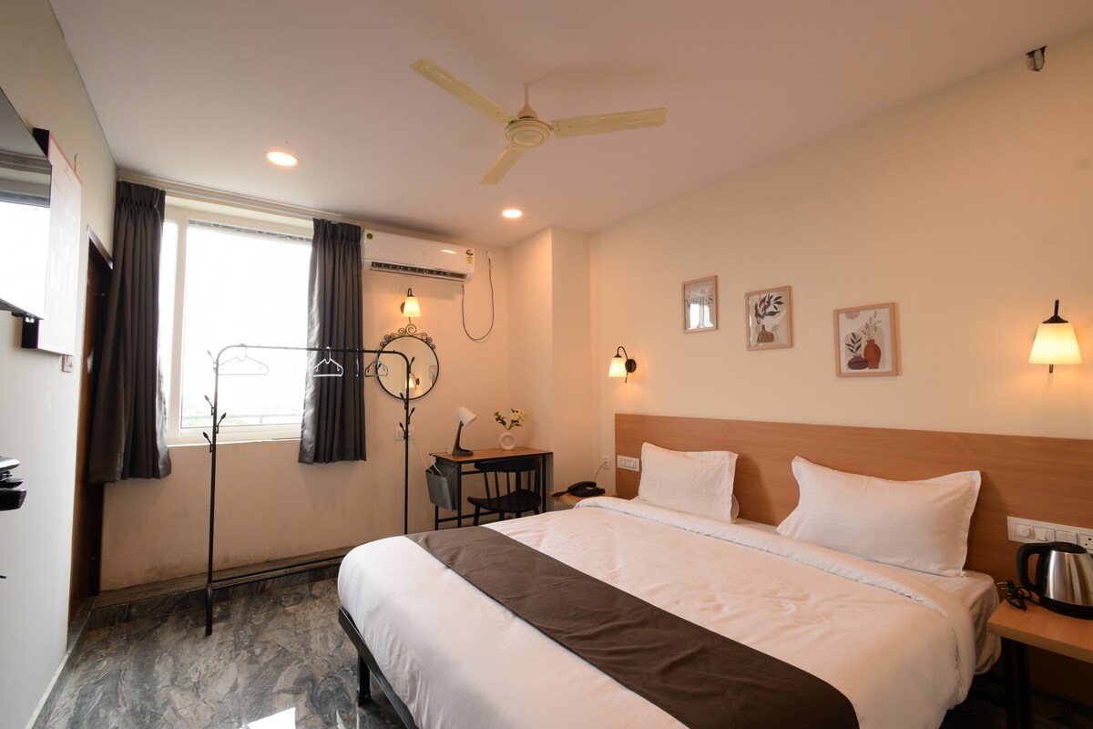 Experience luxury and comfort in our Executive Suite in Hyderabad, perfect for business travelers or couples seeking a premium stay. This elegantly furnished suite features a spacious bedroom, modern ensuite bathroom, high-speed Wi-Fi, air conditioning, and a dedicated work desk. Located in a prime area with easy access to IT hubs, shopping centers, and restaurants, it offers both convenience and class.