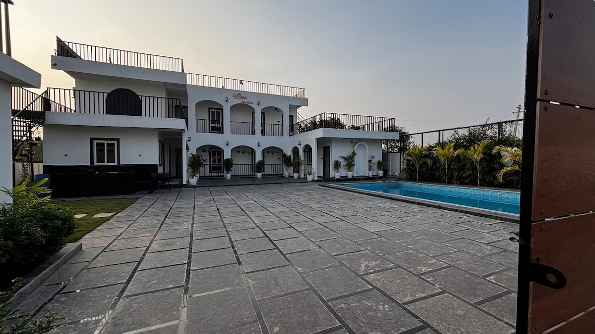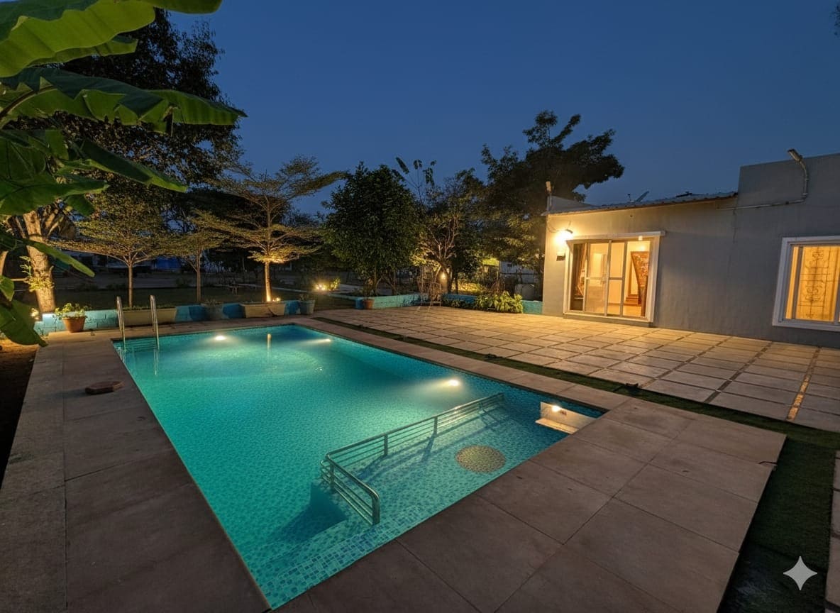 Escape to a newly built farmhouse set in a 7-acre mango orchard along Shankarpally–Chevella Road, just minutes from Pragati Resorts. This serene retreat offers 2 cozy bedrooms (perfect for 4 guests), a private swimming pool, spacious dining & lounge areas, a fully equipped kitchen, outdoor party space, and unlimited high-speed Wi-Fi. Ample on-site parking adds convenience. Whether you seek relaxation or a fun gathering, this farmhouse provides the perfect blend of comfort and privacy.