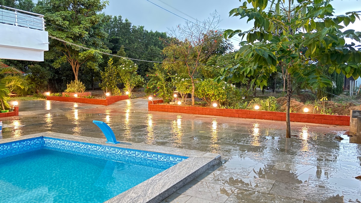 Near Hyderabad, a charming wooden cabin awaits amidst a lush mango tree haven. Embrace the tranquility as you cool off in your private pool, surrounded by the sweet aroma of mango blossoms. Days are spent wandering through the orchard, picking ripe fruit, while evenings invite you to unwind on the veranda, listening to the symphony of nature. A perfect fusion of nature and comfort, this cabin is an oasis of serenity just beyond the city's bustle.