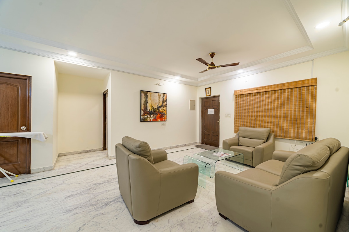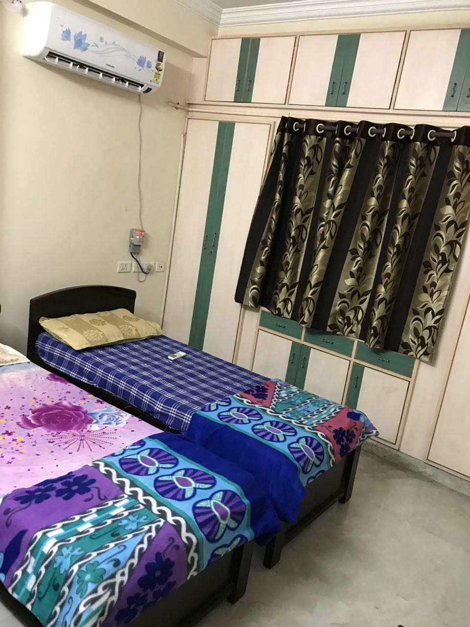 Forget your worries in this spacious and serene space nestled in the heart of the city of Hyderabad, MLA Colony, Banjarahills. Our scenic 3 BHK(AC) apartment offers the perfect blend of convenience and tranquility. Located in a calm neighborhood, away from traffic/pollution it’s just minutes away from popular malls, shopping centers, hotels and hospitals. With all the basic amenities it ensures a comfortable stay for your family. Whether you're here for work or leisure, you'll feel right at home