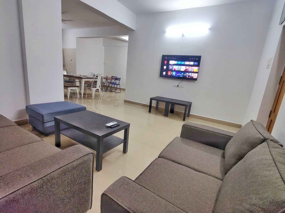 Relax with the Executive and a peaceful place to stay. The centrally located place welcomes you to this 2 bhk Flat. Once inside, the 4k TV and Sofa set in the hall makes it perfect for Movies and relaxation. Seamless WiFi connection is perfect for your work. You have a Simple and useful kitchen and Dining table Leftside Spacious Master bedroom with king-size Bed and second Bedroom has a queen-size bed Both are having attached Bathrooms with air conditioning. Both the Bedrooms have Chilled AC.