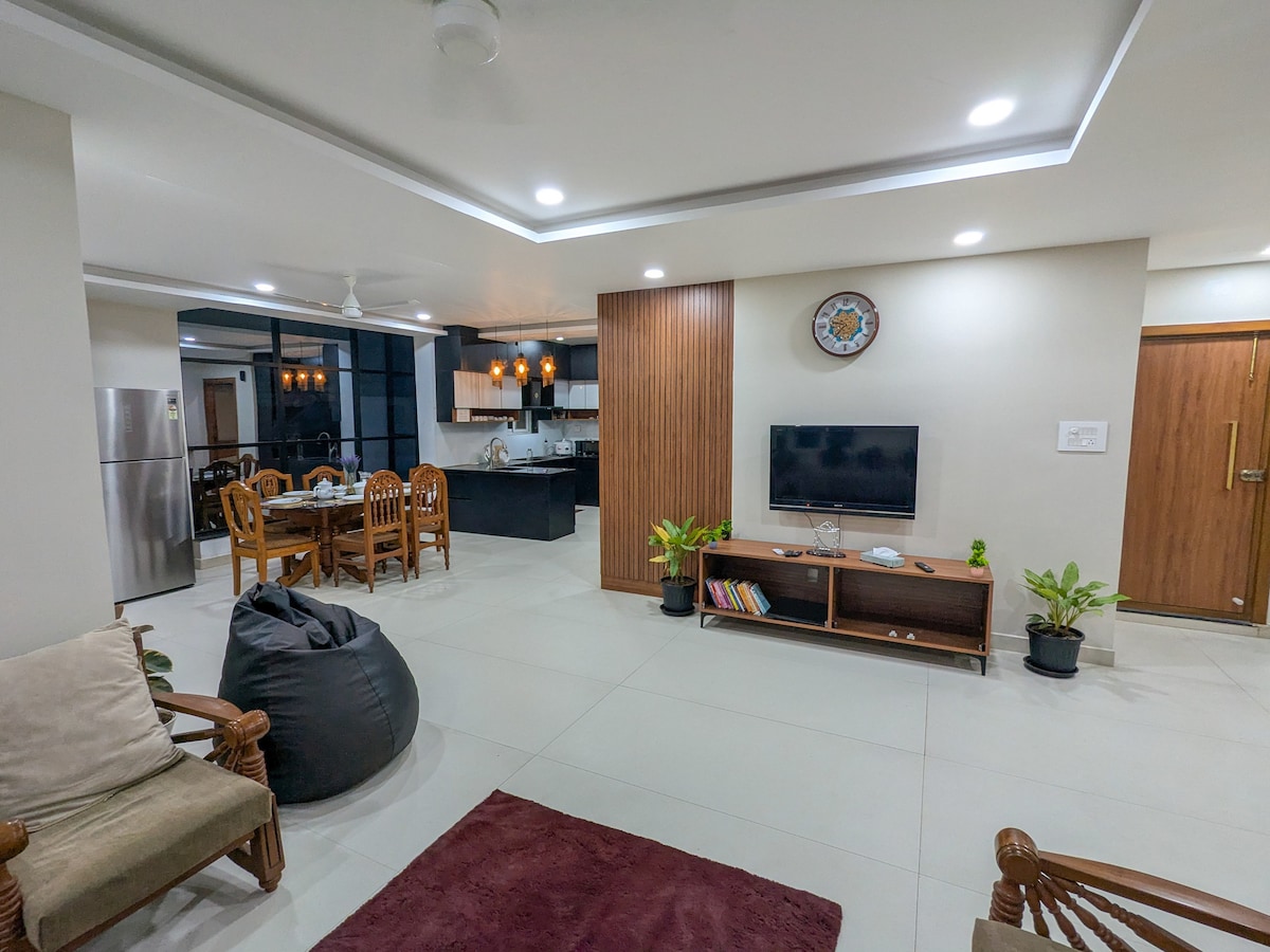 Welcome to our stylish 3 BHK apartment, ideal for short or long stays. Enjoy 3 AC bedrooms with attached baths, a cozy living room with a 43" Smart TV, high-speed Wi-Fi, and an indoor swing. The fully equipped kitchen includes a gas stove, microwave, RO purifier, fridge, and utensils. Conveniently located near Hitech City Metro, Usha Malpuri's Kitchen (100 m), US Visa Center (1 km), Cable Bridge, and major IT hubs..