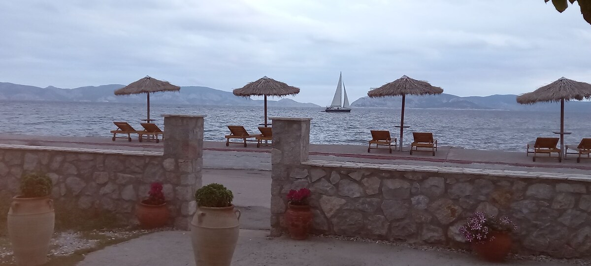 Kick back and relax in this calm, stylish room with big and beautiful balcony with a great sea view over the entire Askeli beach area. It has a fully equipped kitchen, smart tv and is only a 40 meters away from the biggest beach of Poros. Supermarket, bakery, bike rental and great restaurants are nearby. Aida studios is located in Askeli area on Poros island. It is higher up which gives it a great view of Askeli beach but it also means the road to get there is uphill and quite steep.